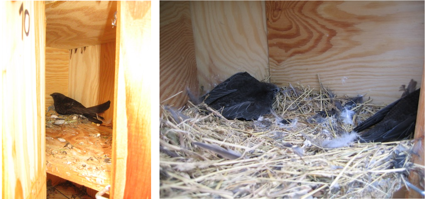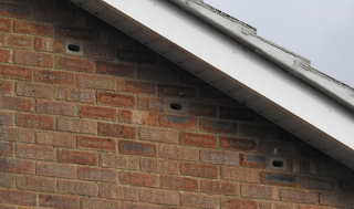 | A House Martin's nest, occupied in 2017 and 3 Swift entrances in the north gable |