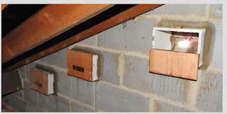Most retrofit projects using the Cambridge System have had the nest box wholly inside the roof space. In this project it was preferred to have the boxes spanning the cavity, embedded in the inner leaf of a cavity wall. The boxes extend only a short distance into the roof space. Boxes this high up under eaves in a roof space are not going to have damp or cold spot problems.