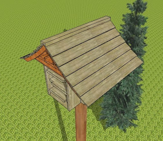Although this sequence shows clearly how it goes together, it may be preferable to assemble the whole thing on the ground with the pole horizontal. Then, reduce the weight by removing the 4 cabinets, the bat slots and gable ends, then erect the pole with the ceiling, roof structure and roof, and add back the cabinets, bat slots, louvres and gable ends.