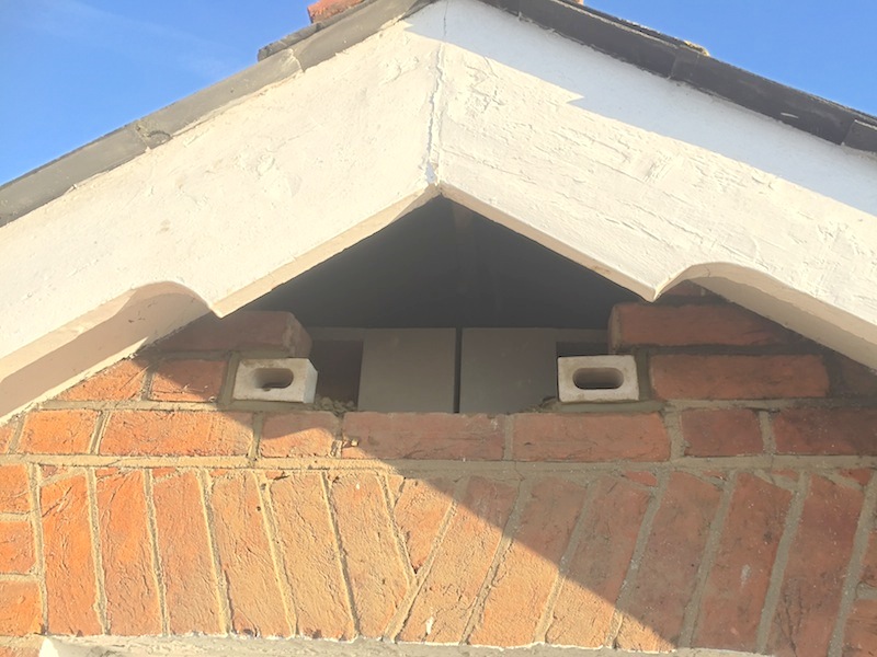 The wall plate was a substantial oak beam and quite deep, with free access from outside. The roofers offered to clean out all the wall plate spaces between the trusses and line each on three sides with ply to create secure spaces with no access into the roof behind and which would also prevent roof debris slipping in to nests as had happened before. Not all the ‘boxes’ are of equal size, and some may be too small. However, by the time they had finished the job the roofers had created upwards of 50 spaces suitable for swifts!! We await May 2017 with great excitement. This is potentially a ‘natural’ swift tower for Ludlow!