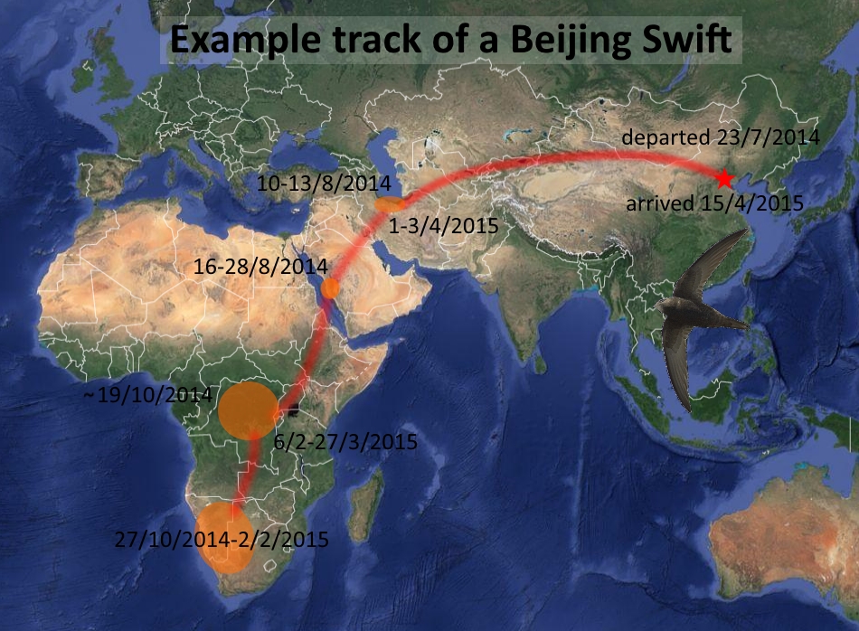 Action for Swifts is delighted to have been involved in the Beijing Swift project where we attached 31 geolocators to Swifts at the Summer Palace in 2014 (see story). On 24th May 2015 we retrapped 13 of these birds, and downloaded all of the data successfully.
